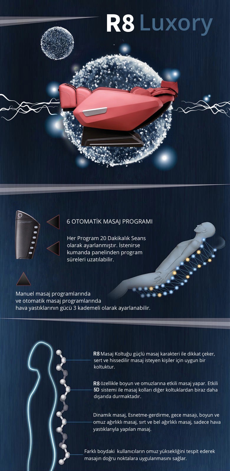 R8 Çok rahatlatıcı bir koltuk. Yıllardır celliniden birçok masaj koltugu aldim. Hepsi iyi koltuklardı ancak R8 masaj olarak çok iyi.