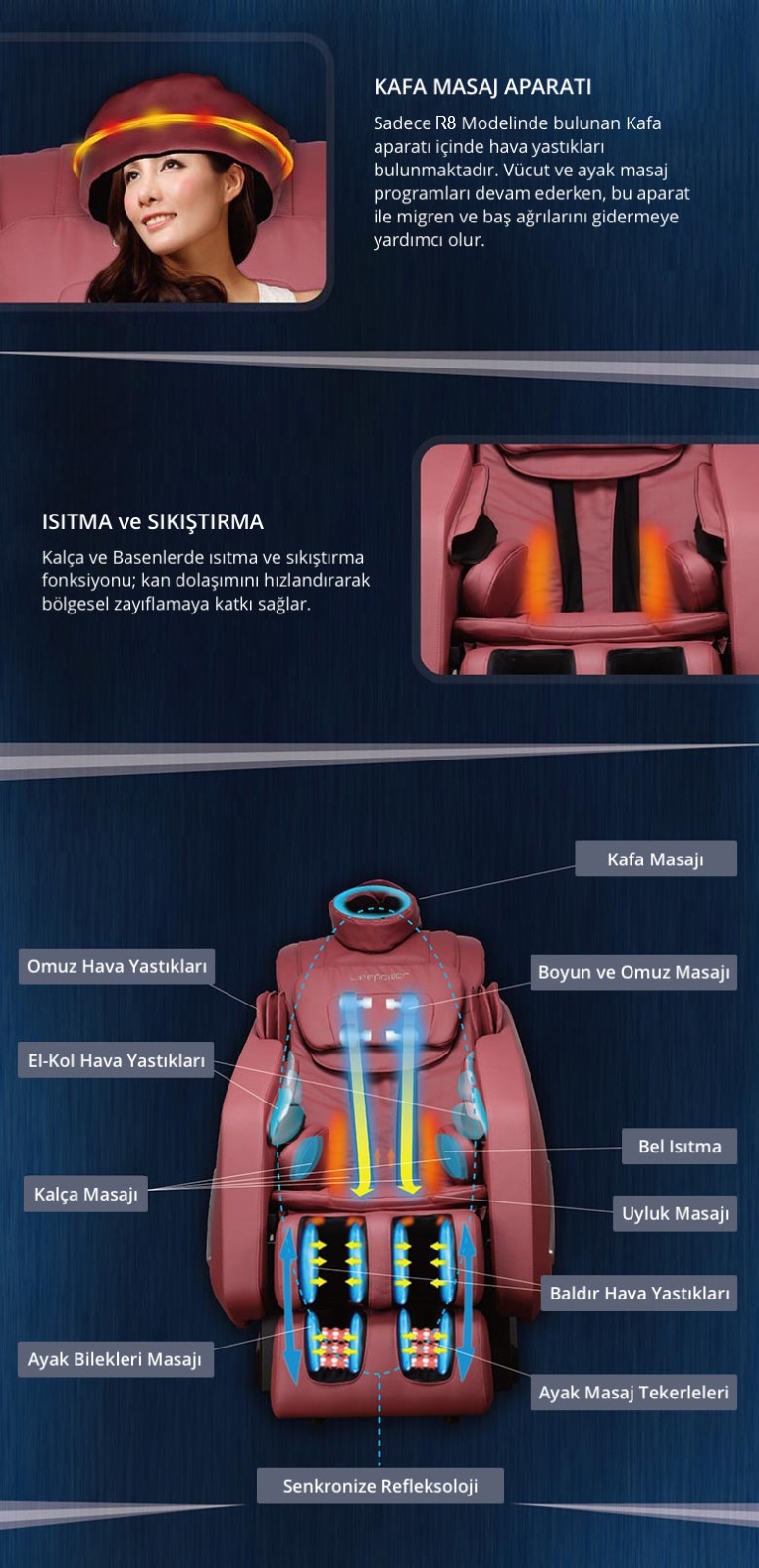 R 8 Model olarakta diğer koltuklardan farkı özellikle ayak masajı konusunda çok iyi ayrıca sert hakkını vererek masaj yapıyor. Zaten masaj koltuğundan indikten sonra yüzünüzdeki gülümseme koltuğun ne kadar kaliteli olduğunu gösteriyor.